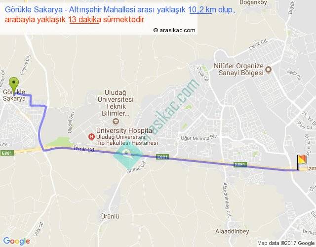 Görükle Sakarya - Altınşehir Mahallesi arası yaklaşık olarak 90 km/h ile yukarıda belirtilen sürede olup, iki yerin kuş uçuşu uzaklığı (mesafesi) 9'dir. Yolculuk otobüsle 16 dakika sürmektedir.