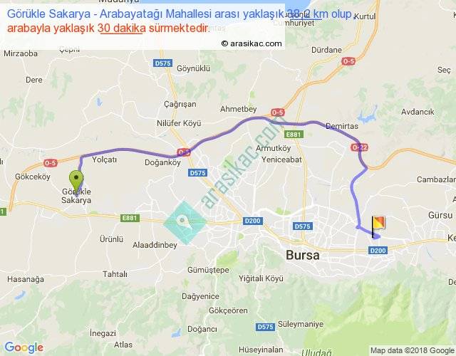 Görükle Sakarya - Arabayatağı Mahallesi arası yaklaşık olarak 90 km/h ile yukarıda belirtilen sürede olup, iki yerin kuş uçuşu uzaklığı (mesafesi) 24'dir. Yolculuk otobüsle 39 dakika sürmektedir.