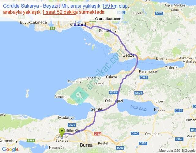 Görükle Sakarya - Beyazıt Mh. arası yaklaşık olarak 90 km/h ile yukarıda belirtilen sürede olup, iki yerin kuş uçuşu uzaklığı (mesafesi) 87'dir. Yolculuk otobüsle 2 saat 25 dakika sürmektedir.