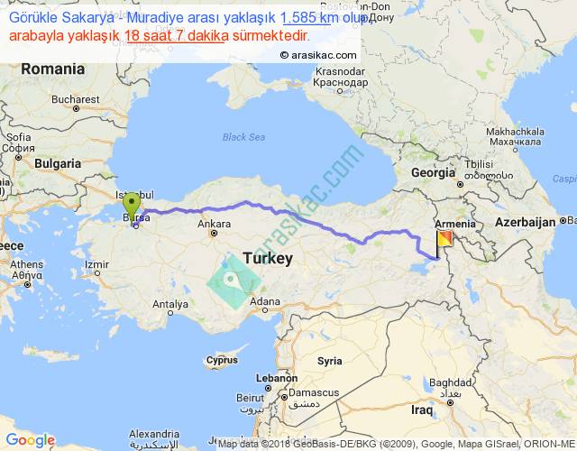 Görükle Sakarya - Muradiye arası yaklaşık olarak 90 km/h ile yukarıda belirtilen sürede olup, iki yerin kuş uçuşu uzaklığı (mesafesi) 1277'dir. Eğer belirtilen yerler arasında uçak seferi var ise bu süre uçakla 1 saat 57 dakika'ya kadar düşebilir. Yolculuk otobüsle 23 saat 33 dakika sürmektedir.