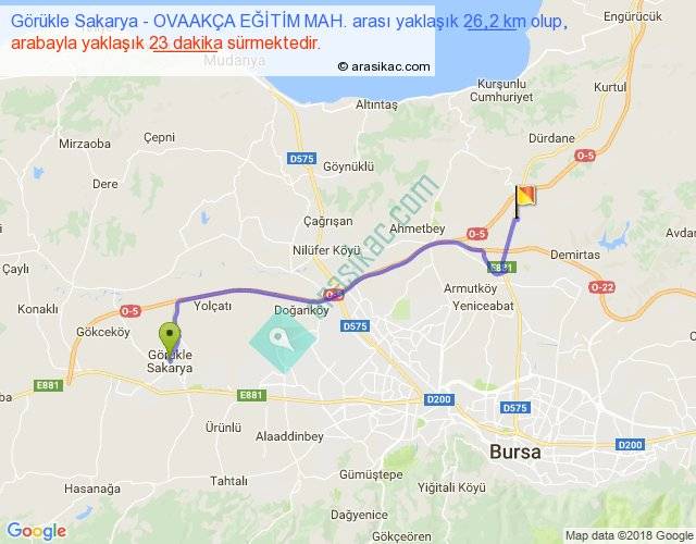 Görükle Sakarya - OVAAKÇA EĞİTİM MAH. arası yaklaşık olarak 90 km/h ile yukarıda belirtilen sürede olup, iki yerin kuş uçuşu uzaklığı (mesafesi) 20'dir. Yolculuk otobüsle 29 dakika sürmektedir.