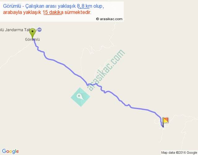 Görümlü - Çalışkan arası yaklaşık olarak 90 km/h ile yukarıda belirtilen sürede olup, iki yerin kuş uçuşu uzaklığı (mesafesi) 8'dir. Yolculuk otobüsle 19 dakika sürmektedir.