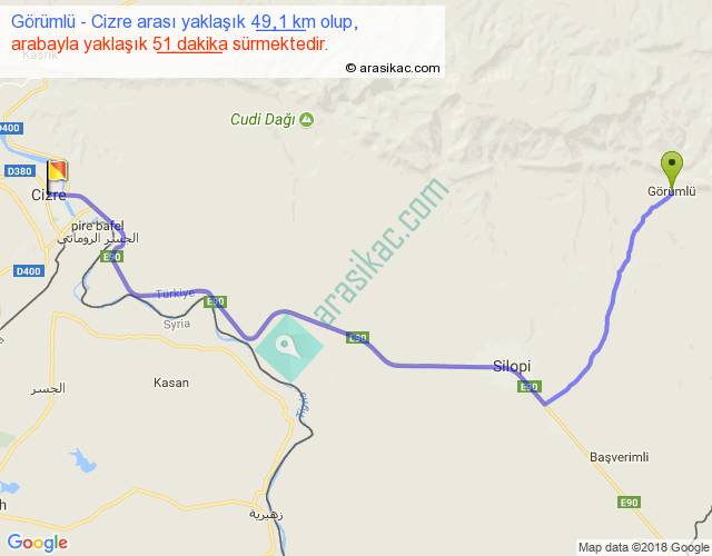 Görümlü - Cizre arası yaklaşık olarak 90 km/h ile yukarıda belirtilen sürede olup, iki yerin kuş uçuşu uzaklığı (mesafesi) 34'dir. Yolculuk otobüsle 1 saat 6 dakika sürmektedir.