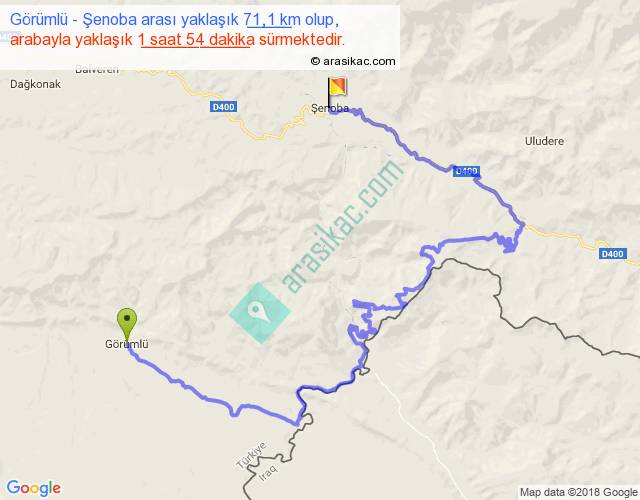 Görümlü - Şenoba arası yaklaşık olarak 90 km/h ile yukarıda belirtilen sürede olup, iki yerin kuş uçuşu uzaklığı (mesafesi) 19'dir. Yolculuk otobüsle 2 saat 28 dakika sürmektedir.