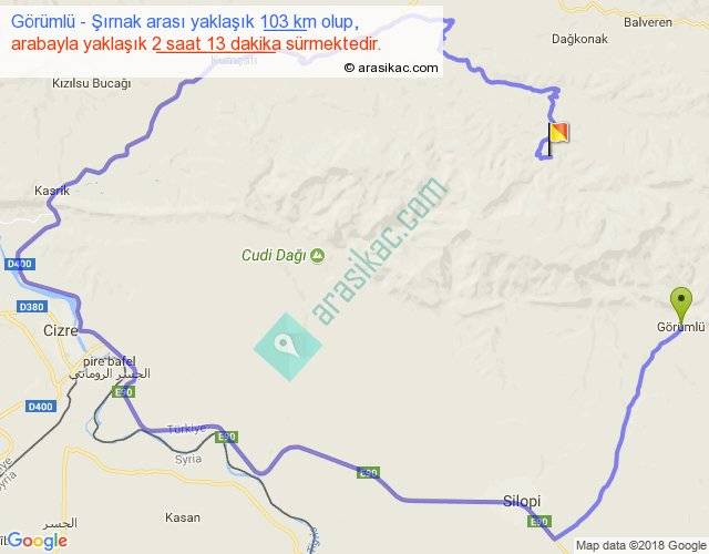 Görümlü - Şırnak arası yaklaşık olarak 90 km/h ile yukarıda belirtilen sürede olup, iki yerin kuş uçuşu uzaklığı (mesafesi) 12'dir. Yolculuk otobüsle 2 saat 52 dakika sürmektedir.