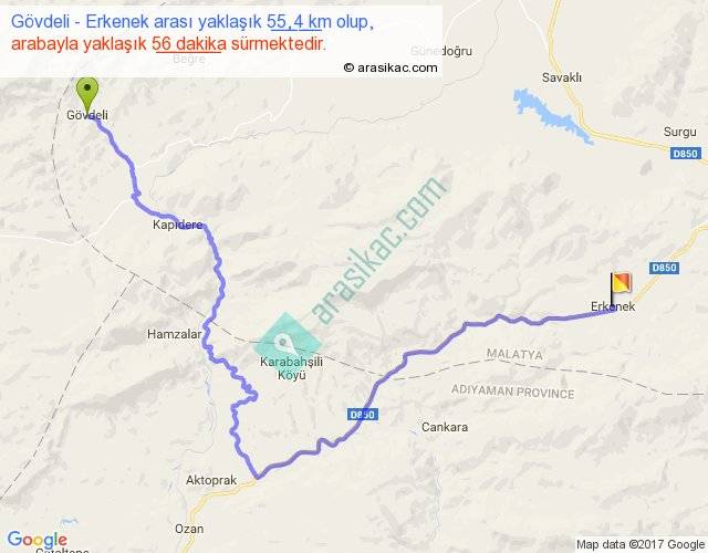 Gövdeli - Erkenek arası yaklaşık olarak 90 km/h ile yukarıda belirtilen sürede olup, iki yerin kuş uçuşu uzaklığı (mesafesi) 30'dir. Yolculuk otobüsle 1 saat 12 dakika sürmektedir.
