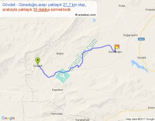 Gövdeli - Günedoğru arası yaklaşık olarak 90 km/h ile yukarıda belirtilen sürede olup, iki yerin kuş uçuşu uzaklığı (mesafesi) 19'dir. Yolculuk otobüsle 45 dakika sürmektedir.