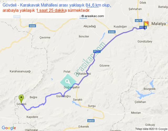 Gövdeli - Karakavak Mahallesi arası yaklaşık olarak 90 km/h ile yukarıda belirtilen sürede olup, iki yerin kuş uçuşu uzaklığı (mesafesi) 65'dir. Yolculuk otobüsle 1 saat 50 dakika sürmektedir.