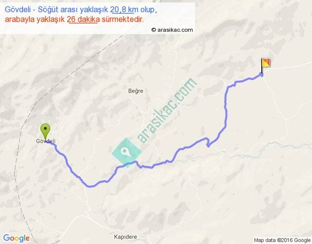 Gövdeli - Söğüt arası yaklaşık olarak 90 km/h ile yukarıda belirtilen sürede olup, iki yerin kuş uçuşu uzaklığı (mesafesi) 14'dir. Yolculuk otobüsle 33 dakika sürmektedir.