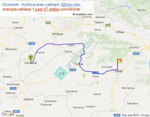 Göynücek - Aydınca arası yaklaşık olarak 90 km/h ile yukarıda belirtilen sürede olup, iki yerin kuş uçuşu uzaklığı (mesafesi) 86'dir. Yolculuk otobüsle 2 saat 19 dakika sürmektedir.