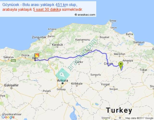 Göynücek - Bolu arası yaklaşık olarak 90 km/h ile yukarıda belirtilen sürede olup, iki yerin kuş uçuşu uzaklığı (mesafesi) 331'dir. Eğer belirtilen yerler arasında uçak seferi var ise bu süre uçakla 30 dakika'ya kadar düşebilir. Yolculuk otobüsle 7 saat 9 dakika sürmektedir.