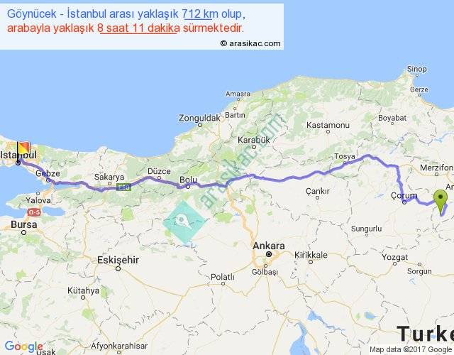 Göynücek - İstanbul arası yaklaşık olarak 90 km/h ile yukarıda belirtilen sürede olup, iki yerin kuş uçuşu uzaklığı (mesafesi) 553'dir. Eğer belirtilen yerler arasında uçak seferi var ise bu süre uçakla 51 dakika'ya kadar düşebilir. Yolculuk otobüsle 10 saat 38 dakika sürmektedir.