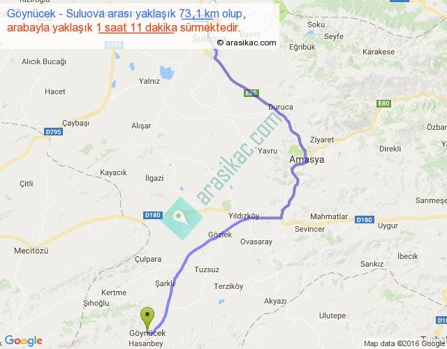 Göynücek - Suluova arası yaklaşık olarak 90 km/h ile yukarıda belirtilen sürede olup, iki yerin kuş uçuşu uzaklığı (mesafesi) 50'dir. Yolculuk otobüsle 1 saat 32 dakika sürmektedir.