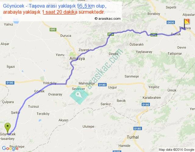 Göynücek - Taşova arası yaklaşık olarak 90 km/h ile yukarıda belirtilen sürede olup, iki yerin kuş uçuşu uzaklığı (mesafesi) 78'dir. Yolculuk otobüsle 1 saat 44 dakika sürmektedir.