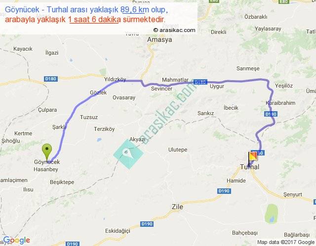 Göynücek - Turhal arası yaklaşık olarak 90 km/h ile yukarıda belirtilen sürede olup, iki yerin kuş uçuşu uzaklığı (mesafesi) 47'dir. Yolculuk otobüsle 1 saat 25 dakika sürmektedir.