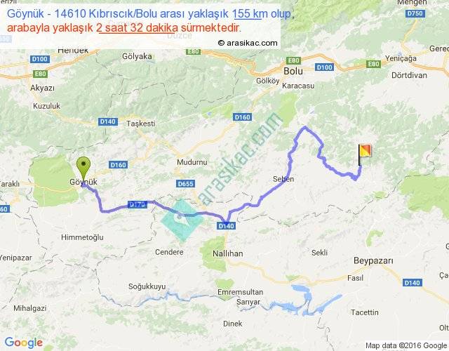 Göynük - 14610 Kıbrıscık Bolu arası yaklaşık olarak 90 km/h ile yukarıda belirtilen sürede olup, iki yerin kuş uçuşu uzaklığı (mesafesi) 91'dir. Yolculuk otobüsle 3 saat 17 dakika sürmektedir.