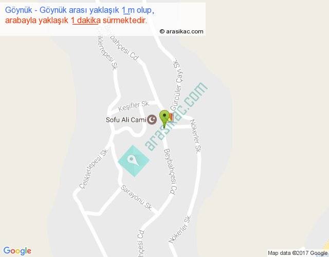 Göynük - Göynük arası yaklaşık olarak 90 km/h ile yukarıda belirtilen sürede olup, iki yerin kuş uçuşu uzaklığı (mesafesi) 0'dir. Yolculuk otobüsle 1 dakika sürmektedir.
