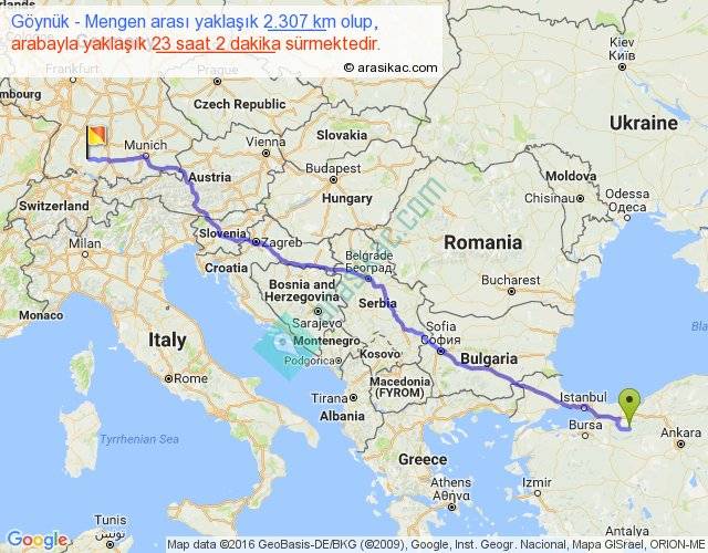 Göynük - Mengen arası yaklaşık olarak 90 km/h ile yukarıda belirtilen sürede olup, iki yerin kuş uçuşu uzaklığı (mesafesi) 1889'dir. Eğer belirtilen yerler arasında uçak seferi var ise bu süre uçakla 2 saat 54 dakika'ya kadar düşebilir. Yolculuk otobüsle 1 gün 5 saat sürmektedir.