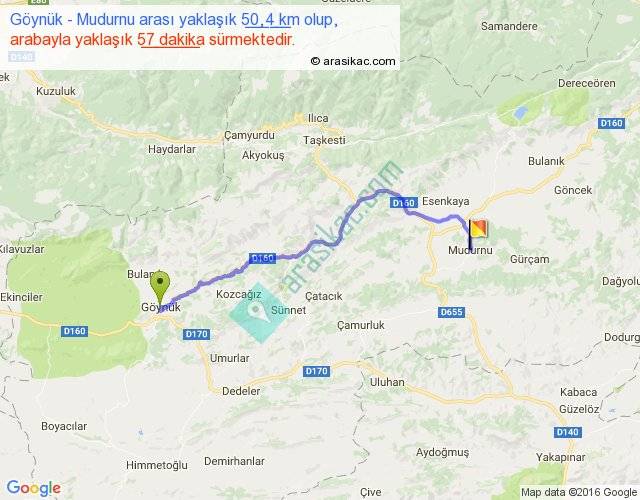 Göynük - Mudurnu arası yaklaşık olarak 90 km/h ile yukarıda belirtilen sürede olup, iki yerin kuş uçuşu uzaklığı (mesafesi) 36'dir. Yolculuk otobüsle 1 saat 14 dakika sürmektedir.