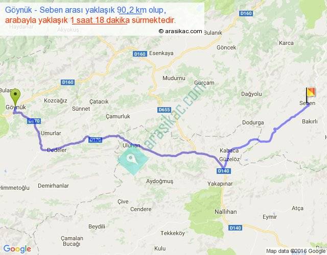 Göynük - Seben arası yaklaşık olarak 90 km/h ile yukarıda belirtilen sürede olup, iki yerin kuş uçuşu uzaklığı (mesafesi) 66'dir. Yolculuk otobüsle 1 saat 41 dakika sürmektedir.