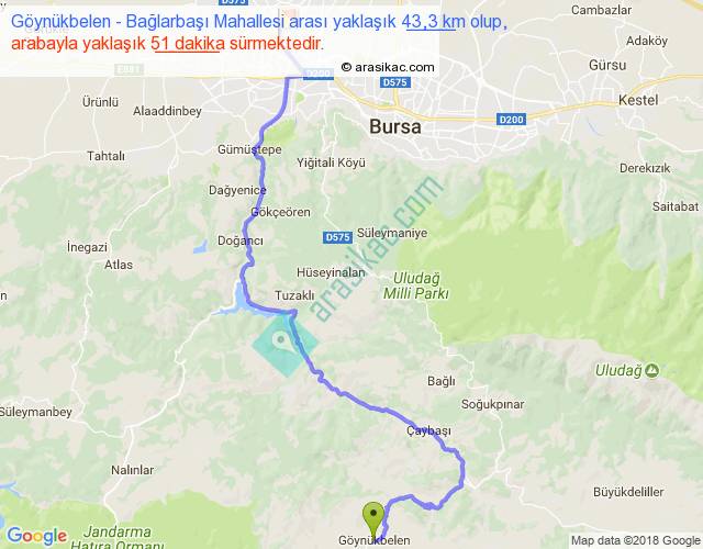 Göynükbelen - Bağlarbaşı Mahallesi arası yaklaşık olarak 90 km/h ile yukarıda belirtilen sürede olup, iki yerin kuş uçuşu uzaklığı (mesafesi) 27'dir. Yolculuk otobüsle 1 saat 6 dakika sürmektedir.