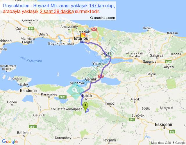 Göynükbelen - Beyazıt Mh. arası yaklaşık olarak 90 km/h ile yukarıda belirtilen sürede olup, iki yerin kuş uçuşu uzaklığı (mesafesi) 113'dir. Yolculuk otobüsle 3 saat 25 dakika sürmektedir.