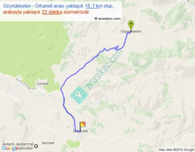 Göynükbelen - Orhaneli arası yaklaşık olarak 90 km/h ile yukarıda belirtilen sürede olup, iki yerin kuş uçuşu uzaklığı (mesafesi) 11'dir. Yolculuk otobüsle 28 dakika sürmektedir.
