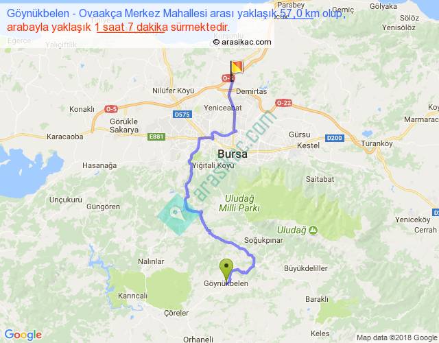Göynükbelen - Ovaakça Merkez Mahallesi arası yaklaşık olarak 90 km/h ile yukarıda belirtilen sürede olup, iki yerin kuş uçuşu uzaklığı (mesafesi) 34'dir. Yolculuk otobüsle 1 saat 27 dakika sürmektedir.