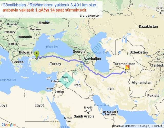 Göynükbelen - Reyhan arası yaklaşık olarak 90 km/h ile yukarıda belirtilen sürede olup, iki yerin kuş uçuşu uzaklığı (mesafesi) 2650'dir. Eğer belirtilen yerler arasında uçak seferi var ise bu süre uçakla 4 saat 04 dakika'ya kadar düşebilir. Yolculuk otobüsle 2 gün 1 saat sürmektedir.