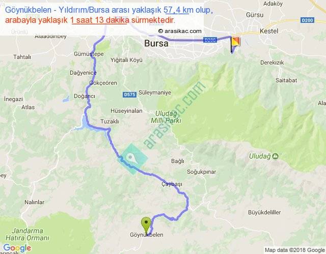 Göynükbelen - Yıldırım Bursa arası yaklaşık olarak 90 km/h ile yukarıda belirtilen sürede olup, iki yerin kuş uçuşu uzaklığı (mesafesi) 23'dir. Yolculuk otobüsle 1 saat 34 dakika sürmektedir.