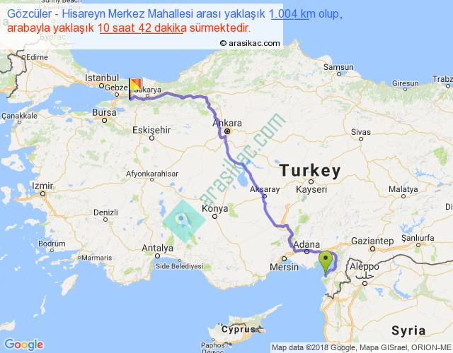 Gözcüler - Hisareyn Merkez Mahallesi arası yaklaşık olarak 90 km/h ile yukarıda belirtilen sürede olup, iki yerin kuş uçuşu uzaklığı (mesafesi) 706'dir. Eğer belirtilen yerler arasında uçak seferi var ise bu süre uçakla 1 saat 05 dakika'ya kadar düşebilir. Yolculuk otobüsle 13 saat 54 dakika sürmektedir.
