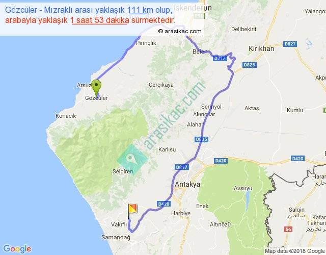 Gözcüler - Mızraklı arası yaklaşık olarak 90 km/h ile yukarıda belirtilen sürede olup, iki yerin kuş uçuşu uzaklığı (mesafesi) 30'dir. Yolculuk otobüsle 2 saat 26 dakika sürmektedir.