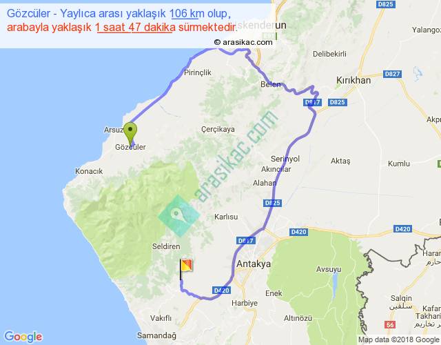 Gözcüler - Yaylıca arası yaklaşık olarak 90 km/h ile yukarıda belirtilen sürede olup, iki yerin kuş uçuşu uzaklığı (mesafesi) 25'dir. Yolculuk otobüsle 2 saat 19 dakika sürmektedir.