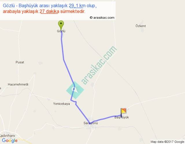 Gözlü - Başhüyük arası yaklaşık olarak 90 km/h ile yukarıda belirtilen sürede olup, iki yerin kuş uçuşu uzaklığı (mesafesi) 22'dir. Yolculuk otobüsle 35 dakika sürmektedir.