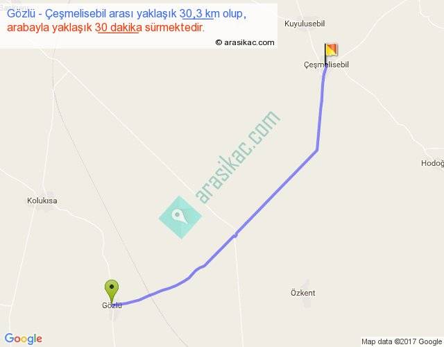 Gözlü - Çeşmelisebil arası yaklaşık olarak 90 km/h ile yukarıda belirtilen sürede olup, iki yerin kuş uçuşu uzaklığı (mesafesi) 28'dir. Yolculuk otobüsle 39 dakika sürmektedir.