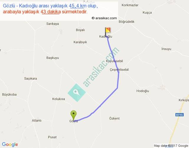 Eğer Gözlü Kadıoğlu arası ne kadar yakar (benzin/mazot) diyorsanız, kilometrede 3 ₺ yakan bir aracınız var ise 135, km'de 4 ₺ yakan bir aracınız var ise 180, km'de 5 ₺ yakan bir aracınız var ise 225 ile bu yolculuğu tamamlayabilirsiniz.