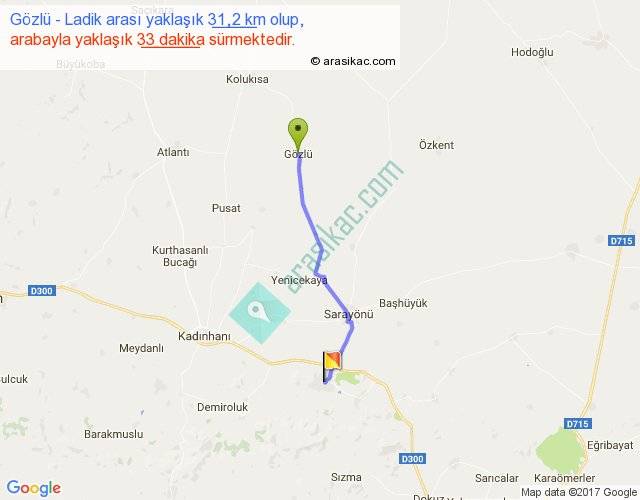 Gözlü - Ladik arası yaklaşık olarak 90 km/h ile yukarıda belirtilen sürede olup, iki yerin kuş uçuşu uzaklığı (mesafesi) 27'dir. Yolculuk otobüsle 42 dakika sürmektedir.