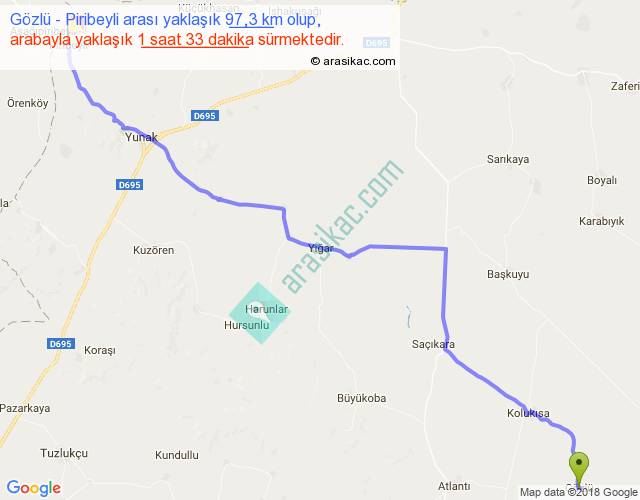 Gözlü - Piribeyli arası yaklaşık olarak 90 km/h ile yukarıda belirtilen sürede olup, iki yerin kuş uçuşu uzaklığı (mesafesi) 80'dir. Yolculuk otobüsle 2 saat 0 dakika sürmektedir.