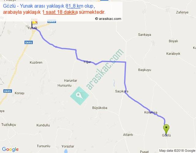 Gözlü - Yunak arası yaklaşık olarak 90 km/h ile yukarıda belirtilen sürede olup, iki yerin kuş uçuşu uzaklığı (mesafesi) 67'dir. Yolculuk otobüsle 1 saat 41 dakika sürmektedir.