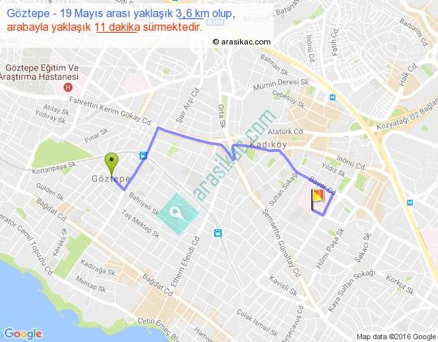 Göztepe - 19 Mayıs arası yaklaşık olarak 90 km/h ile yukarıda belirtilen sürede olup, iki yerin kuş uçuşu uzaklığı (mesafesi) 2'dir. Yolculuk otobüsle 14 dakika sürmektedir.