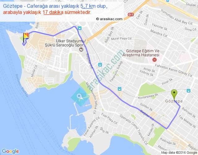Göztepe - Caferağa arası yaklaşık olarak 90 km/h ile yukarıda belirtilen sürede olup, iki yerin kuş uçuşu uzaklığı (mesafesi) 4'dir. Yolculuk otobüsle 22 dakika sürmektedir.