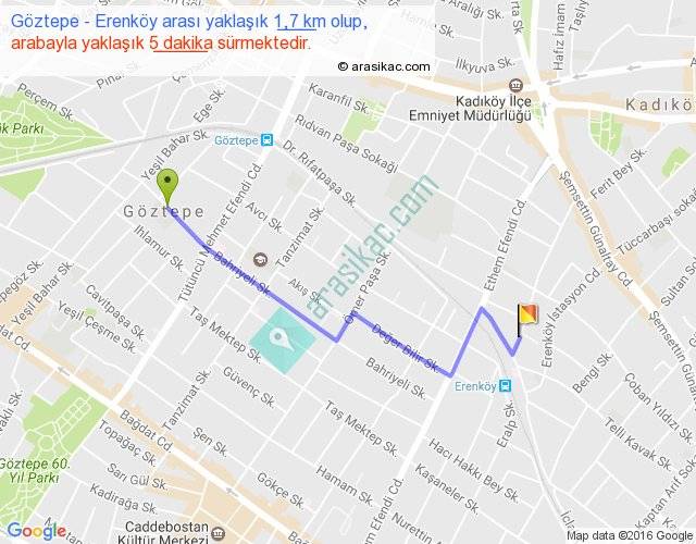 Göztepe - Erenköy arası yaklaşık olarak 90 km/h ile yukarıda belirtilen sürede olup, iki yerin kuş uçuşu uzaklığı (mesafesi) 1'dir. Yolculuk otobüsle 6 dakika sürmektedir.