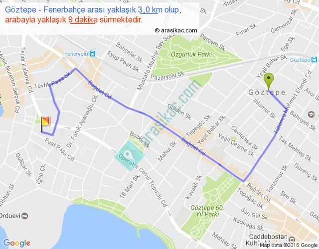 Göztepe - Fenerbahçe arası yaklaşık olarak 90 km/h ile yukarıda belirtilen sürede olup, iki yerin kuş uçuşu uzaklığı (mesafesi) 2'dir. Yolculuk otobüsle 11 dakika sürmektedir.