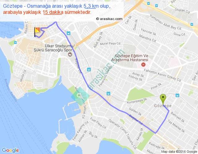 Göztepe - Osmanağa arası yaklaşık olarak 90 km/h ile yukarıda belirtilen sürede olup, iki yerin kuş uçuşu uzaklığı (mesafesi) 3'dir. Yolculuk otobüsle 19 dakika sürmektedir.