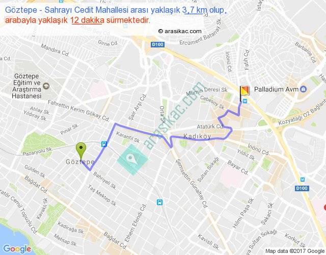 Göztepe - Sahrayı Cedit Mahallesi arası yaklaşık olarak 90 km/h ile yukarıda belirtilen sürede olup, iki yerin kuş uçuşu uzaklığı (mesafesi) 2'dir. Yolculuk otobüsle 15 dakika sürmektedir.