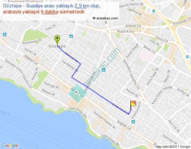 Göztepe - Suadiye arası yaklaşık olarak 90 km/h ile yukarıda belirtilen sürede olup, iki yerin kuş uçuşu uzaklığı (mesafesi) 2'dir. Yolculuk otobüsle 11 dakika sürmektedir.