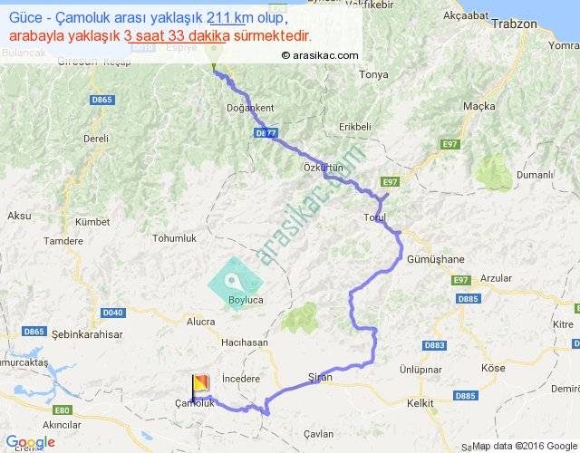 Güce - Çamoluk arası yaklaşık olarak 90 km/h ile yukarıda belirtilen sürede olup, iki yerin kuş uçuşu uzaklığı (mesafesi) 85'dir. Yolculuk otobüsle 4 saat 36 dakika sürmektedir.