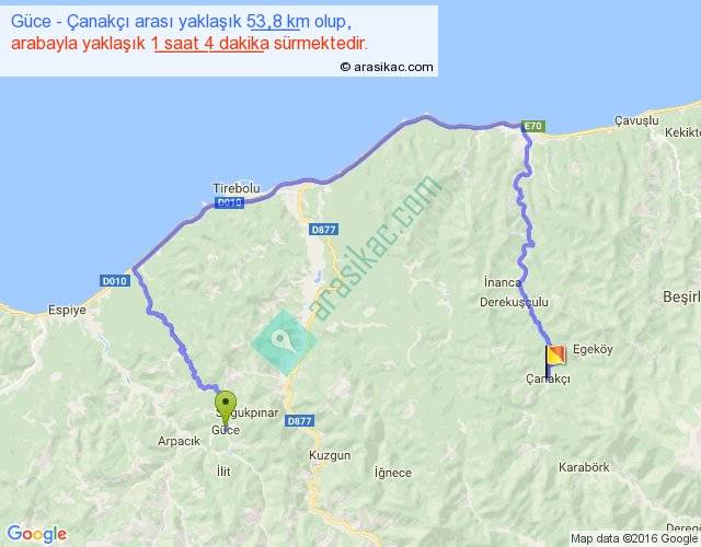 Eğer Güce Çanakçı arası ne kadar yakar (benzin/mazot) diyorsanız, kilometrede 3 ₺ yakan bir aracınız var ise 159, km'de 4 ₺ yakan bir aracınız var ise 212, km'de 5 ₺ yakan bir aracınız var ise 265 ile bu yolculuğu tamamlayabilirsiniz.