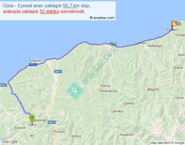 Güce - Eynesil arası yaklaşık olarak 90 km/h ile yukarıda belirtilen sürede olup, iki yerin kuş uçuşu uzaklığı (mesafesi) 34'dir. Yolculuk otobüsle 1 saat 7 dakika sürmektedir.