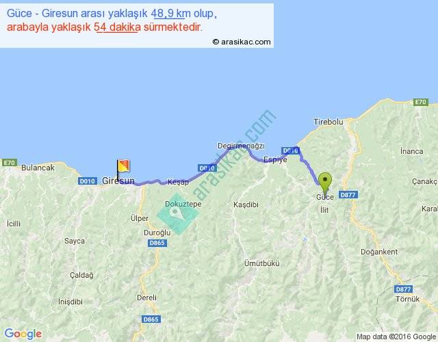 Güce - Giresun arası yaklaşık olarak 90 km/h ile yukarıda belirtilen sürede olup, iki yerin kuş uçuşu uzaklığı (mesafesi) 35'dir. Yolculuk otobüsle 1 saat 10 dakika sürmektedir.